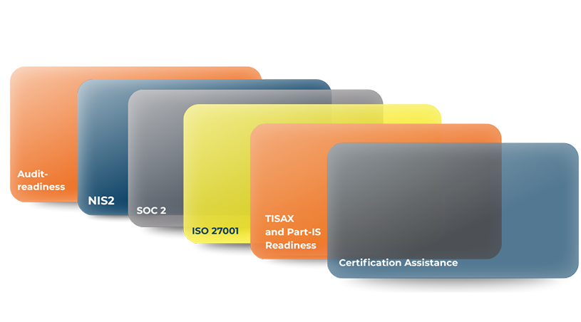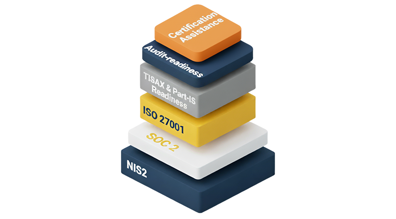– Audit-readiness and Certification Assistance: We provide audit-readiness, certification assistance, and expert guidance for frameworks like NIS 2, SOC 2, ISO 27001, TISAX and Part-IS.